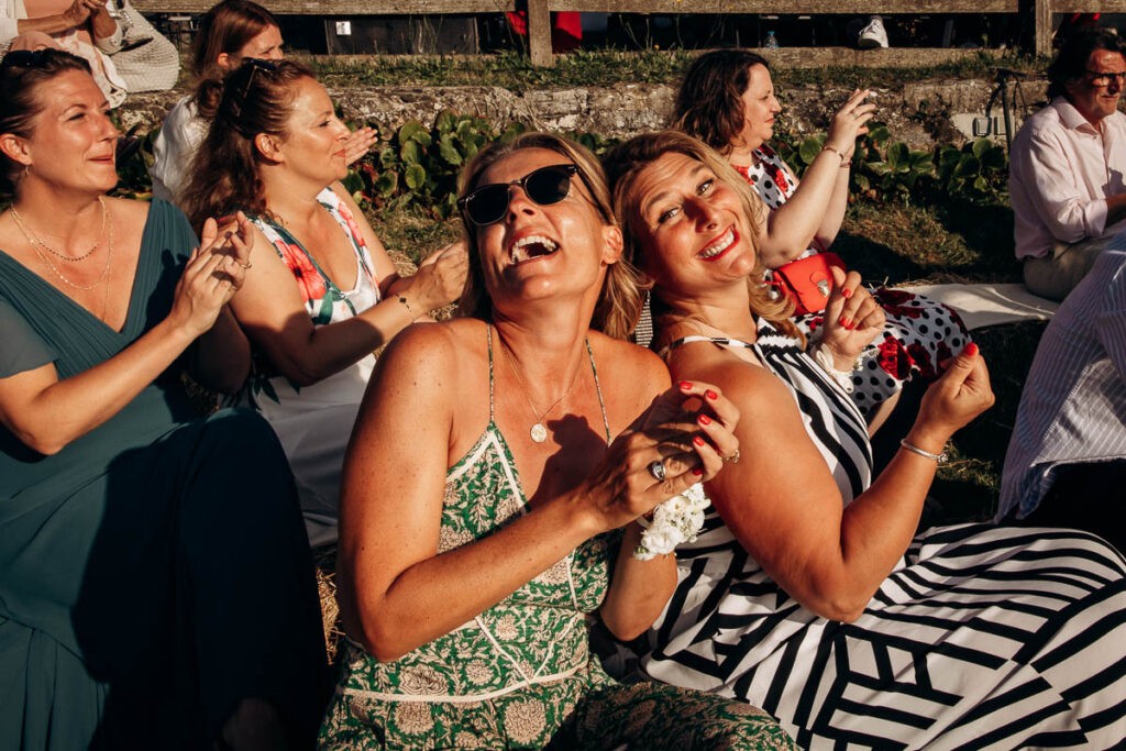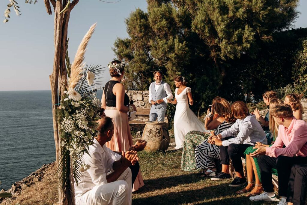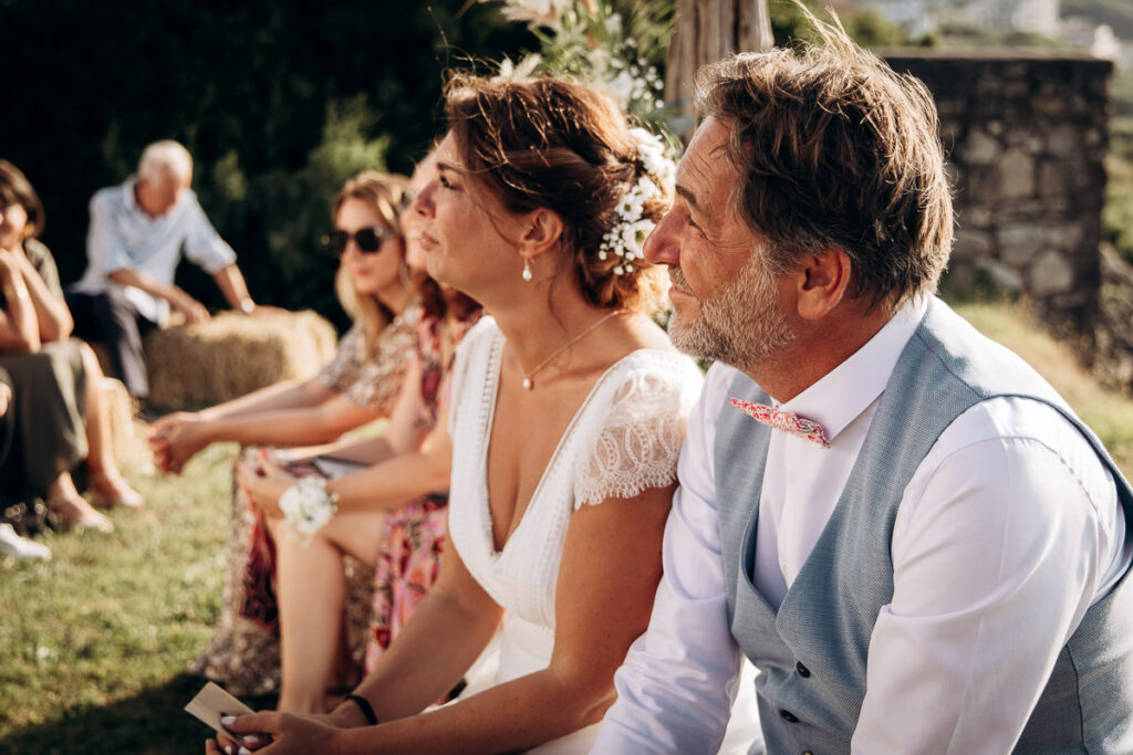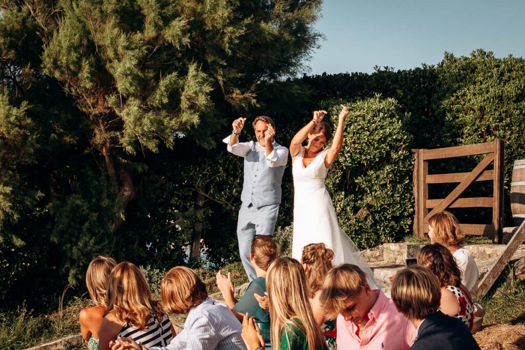 Après la cérémonie si émouvante, vos proches sont invités à se tenir debout ou à former une haie d’honneur pour célébrer les jeunes mariés. On peut alors lancer du riz, des pétales de fleurs, des confettis compostables, onduler des rubans, faire des bulles aux mariés … Les mariés vont sortir main dans la main en profitant d’une ovation debout. Pensez à vous arrêter au milieu de vos invités et vous embrasser, cela fera une magnifique photo ! Puis vient le moment de féliciter les mariés, les embrasser et les remercier pour cette magnifique cérémonie et de commencer la fête …