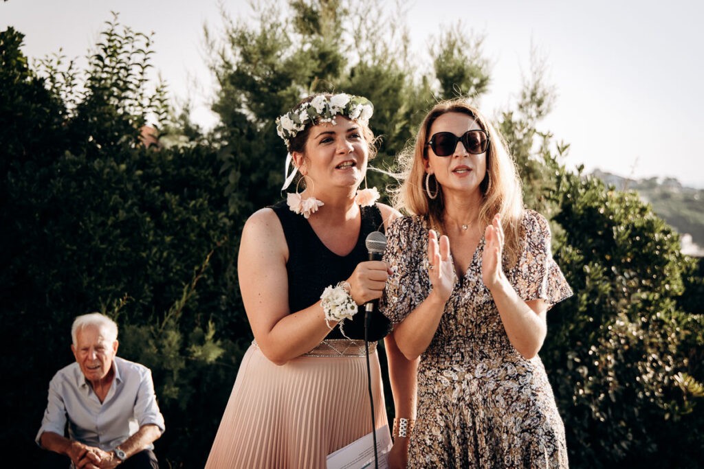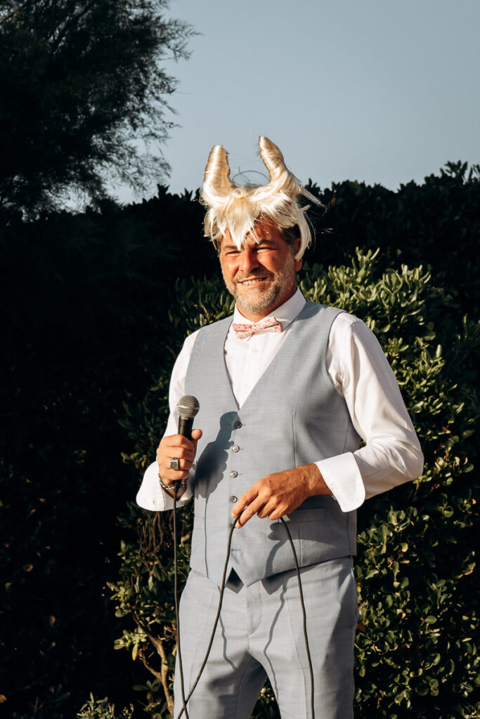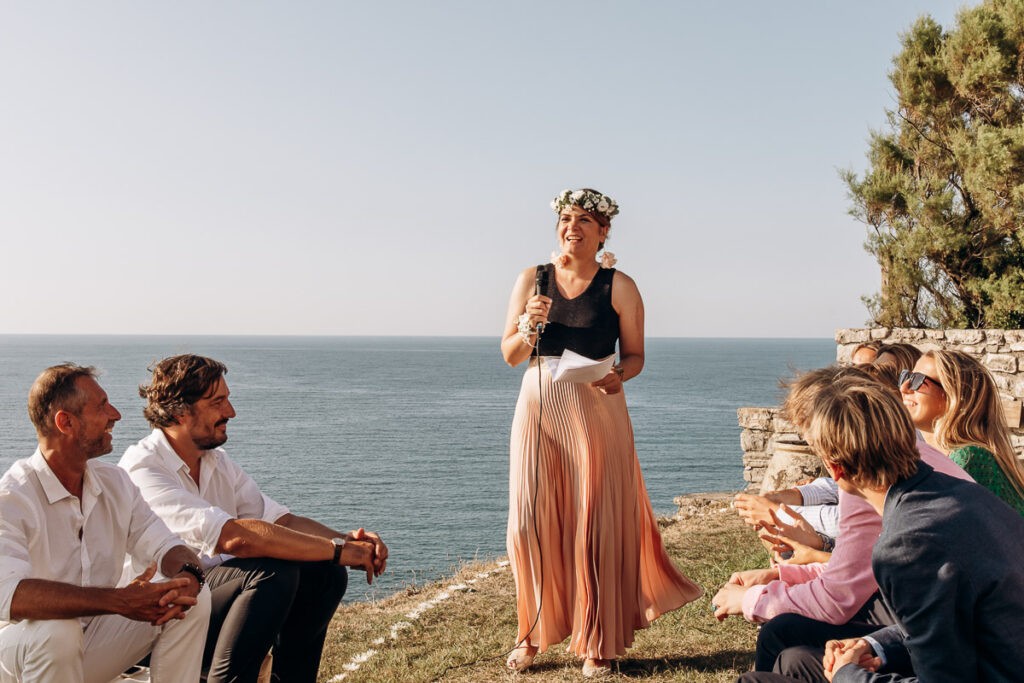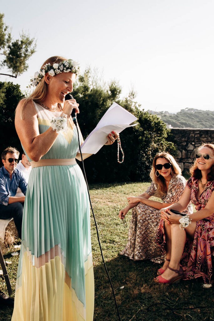 Vous pouvez demander à un ami proche de présider et animer votre cérémonie laïque. Cela peut être un frère ou une soeur, un de vos témoins. Dans tous les cas ce sera une personne proche de vous 2 qui vous a accompagné tout le long de votre histoire d’amour. Cet officiant pourra ponctuer son discours d’introduction d’anecdotes pleines d’humour ou émouvantes, sans vouloir vous mettre mal à l’aise bien sur. Pensez également aux personnes plus agrées présentes qui n’auraient jamais assisté à une cérémonie de ce type. Un livret ou un panneau d’accueil leur permettra d’e comprendre les usages …