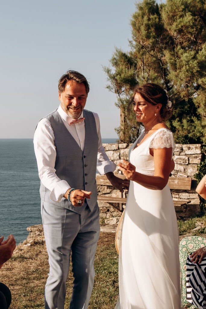 Lorsque vous passez l’alliance au doigt de votre bien-aimé(e), vous allez accompagner ce geste par quelques mots symboliques. Voici le lien vers 5 textes pour l’échange des alliances dont vous pouvez vous inspirer. Ensuite, l’officiante déclare que le couple est uni et que les mariés peuvent s’embrasser.