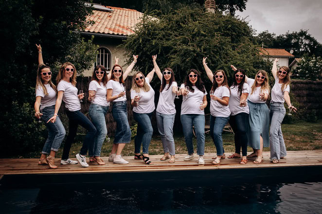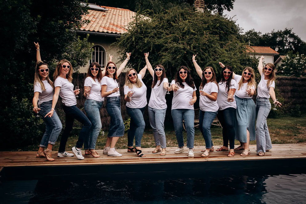 Heureusement la pluie a diminué et les copines étant en grande forme, nous avons profité du jardin. Après un défilé de la future mariée, je leur ai proposé de se poser pour une photo les pieds dans l’eau. Mais je n’imaginais pas une seconde la suite des évènements ! Les amies se sont enflammées et ont sauté dans la piscine toute habillées. C’était absolument génial et j’ai adoré passer ce moment avec vous toutes. La seance evjf s’est donc transformée en pool party 🙂
