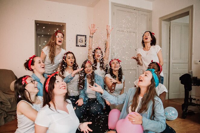 À peine arrivée à la maison, petit tour d’horizon et on investit le salon. En premier on met la musique, on danse, on rit … Ensuite on sort les confettis, les cerceaux, tout ça permet de faire des photos fun, vous ne trouvez pas ?