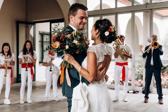 Pendant qu’Estelle et Laurent célébraient leur mariage, une belle surprise se mettait en place à l’entrée de la mairie. J’étais au courant car quelques jours avant votre grand jour, je contacte les témoins des mariés. Dès que la banda a commencé ses premières notes, les regards de Laurent et Estelle se sont remplis de larmes. Tellement émus par cette belle attention. Mais il faut bien reconnaitre que leur émotion nous a tous saisi …