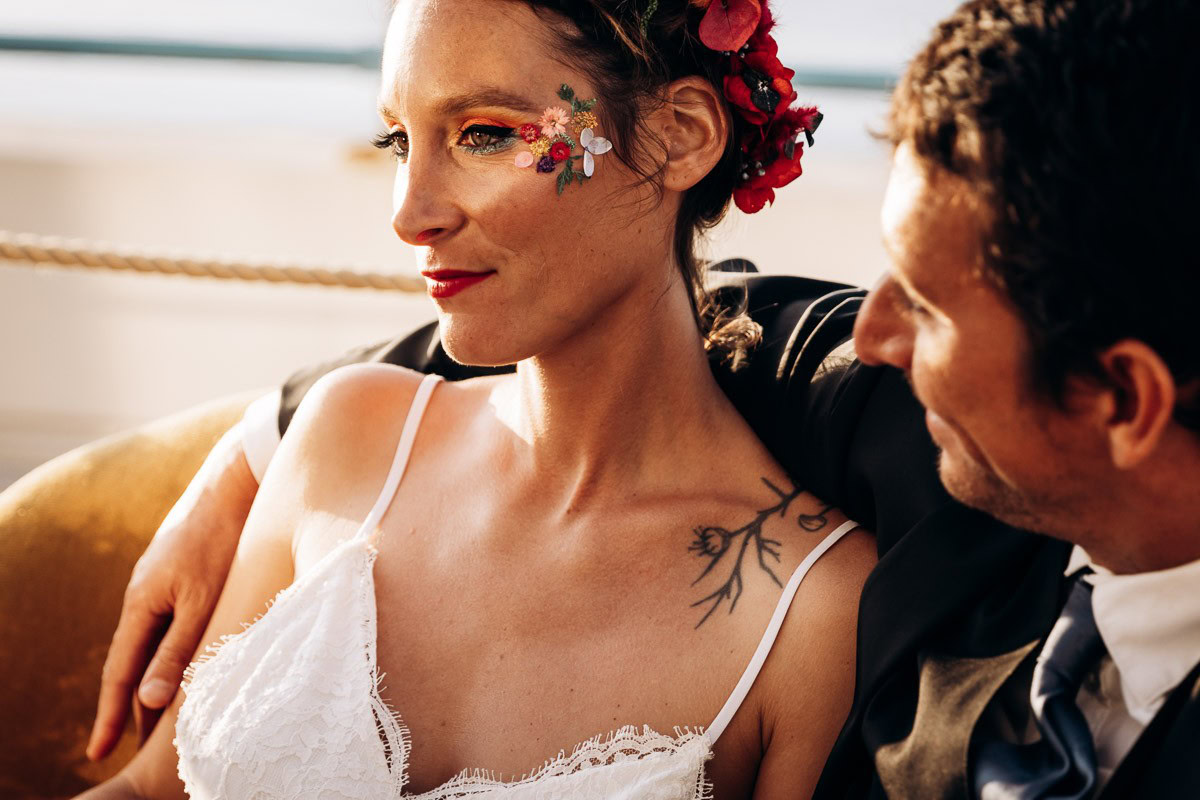 Vous le découvrirez sur les photos partagées, ce reportage a fait la part belle à une décoration colorée. La décoration florale, l’arche pour la cérémonie, la table de réception et tous les accessoires de décoration tels les bougeoirs … Des lignes arrondies jusqu’à la papeterie créée spécialement pour cet évènement.