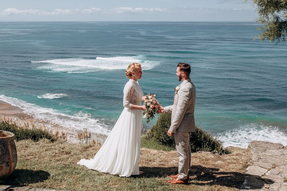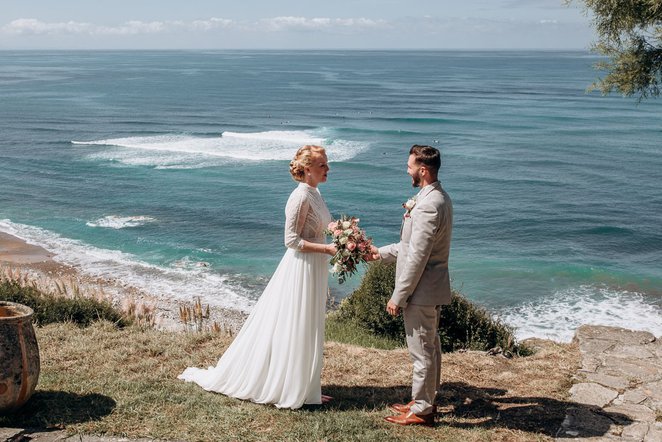 Leurs invités les attendant devant la mairie de Bidart pour leur cérémonie civile, Valérie et Sylvain ont accepté ma proposition. Dès lors, je les ai guidé face à l’océan pour ce moment qui restera unique à leurs yeux …