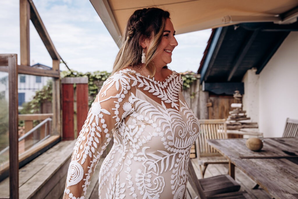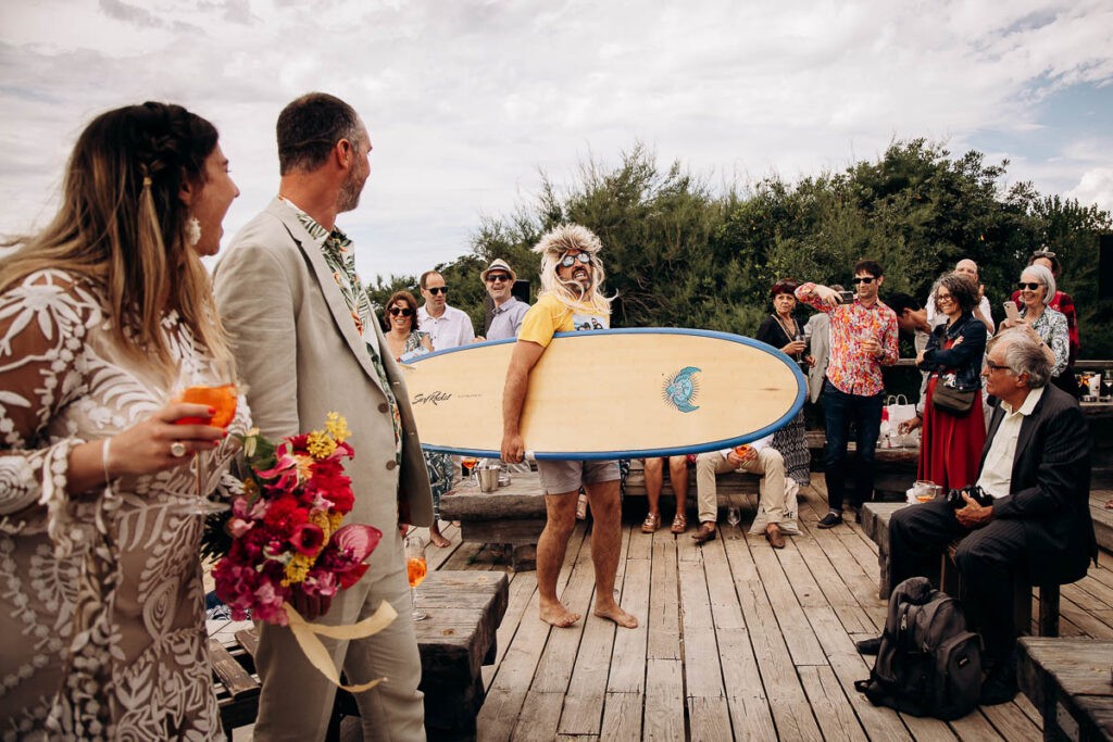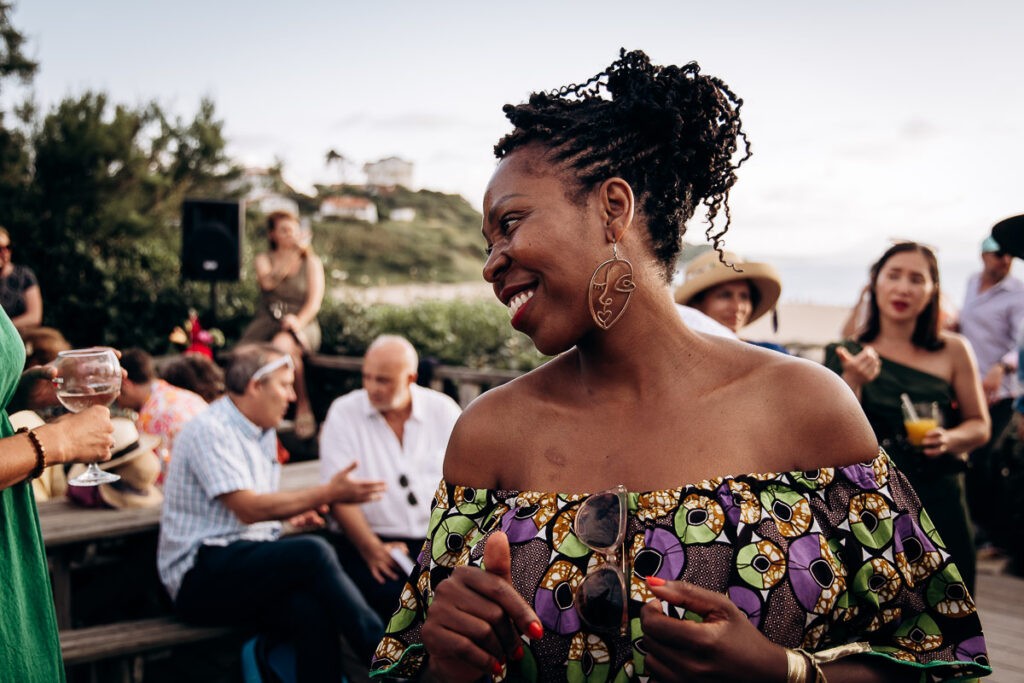 Après des préparatifs à Bidart, direction la mairie sous la fournaise. Dans mon souvenir, il faisait une chaleur étouffante et surtout pas d’air ! Après la cérémonie civile, direction la plage des embruns pour rejoindre leur lieu de réception. Il faut dire que Clemence et Jimmy ont des amis venus du monde entier et ce couple généreux a voulu les réunir dans un lieu authentique et près de l’océan. Pour débuter les festivités, place à la cérémonie laïque. C’est sur la terrasse de la Voile Rouge (Bela Gorri en basque) face à l’océan que tous les invités se sont réunis pour accueillir nos mariés. Une cérémonie atypique et pleine d’humour et de belles émotions pour ce couple.