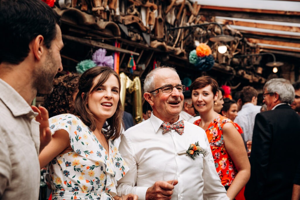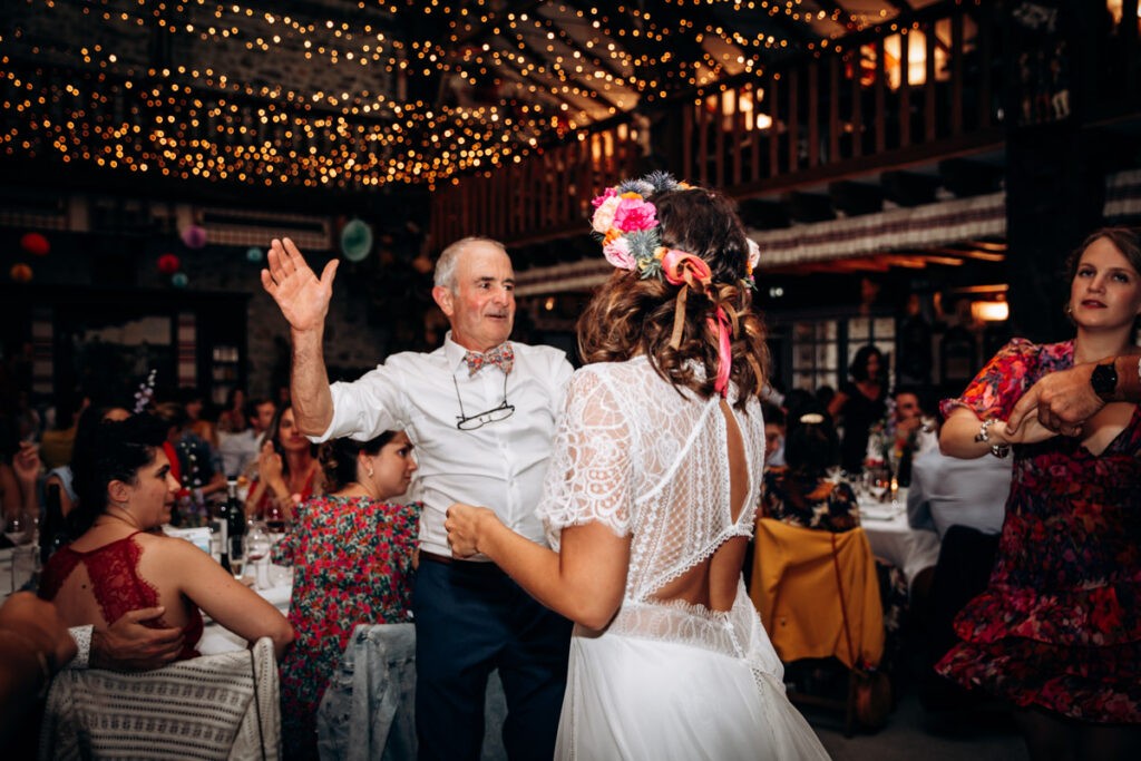 Veronique de Coclico et son équipe avait installé une immense guirlande lumineuse et de jolies fleurs colorées en centre de table. Les fleurs qui avaient été mises en bout de bancs à l’église ont été installées sur les chaises de la table d’honneur. Ce mariage coloré et fleuri a littéralement enchanté tous les invités.