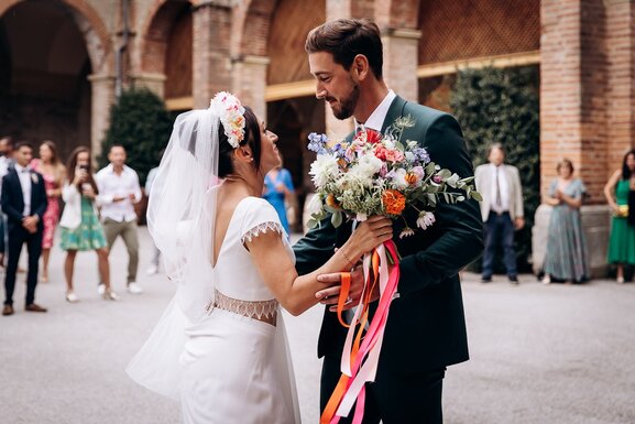 Les fleurs sont indispensables pour un mariage Gipsy Chic. Choisissez des bouquets décontractés avec des fleurs sauvages, des pivoines et des roses aux teintes chaudes. Pour Marine la mariée, Sarah avait créé une sublime couronne de fleurs. Pour les demoiselles d’honneur, une fine couronne ou des bracelets fleuris ajoutant une touche bohème à leur robe si élégante.