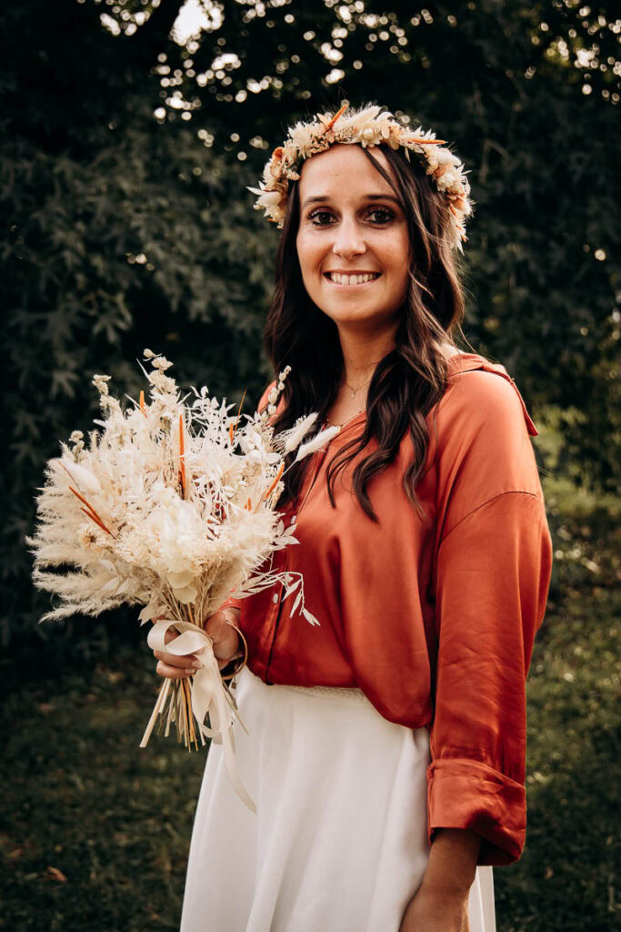 Pour les fleurs, notre mariée a choisi les fleurs séchées de teinte beige agrémentée de petites fleurs orangées. En effet, il n’existe pas de fleurs de couleur terracota. C’est une couleur chaude et rassurante, idéale pour un mariage en automne mais elle peut rayonner toute l’année. Préparez vous à découvrir très bientôt la suite de leur mariage et à être ébloui par leur décoration …