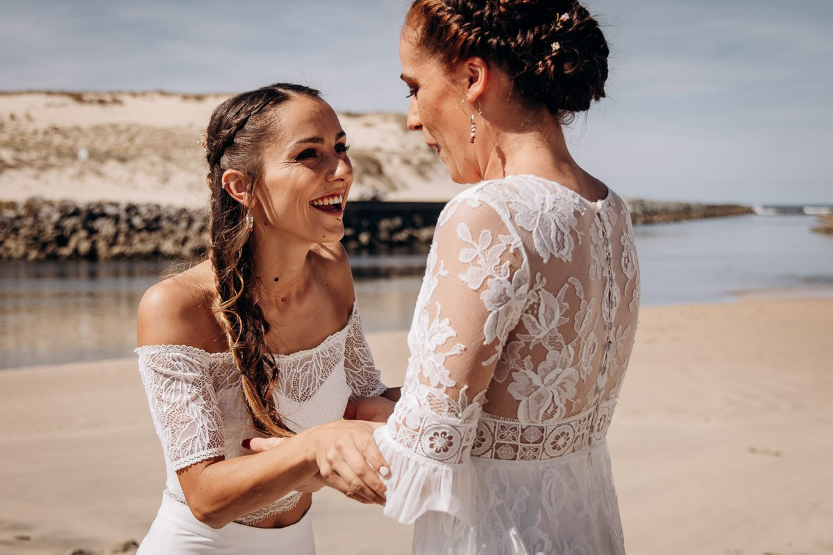 Mariage à Vieux Boucau près de la plage dans les landes. Un mariage avec 2 jeunes femmes dans leur magnifique robe de mariée. A découvrir leur cérémonie laïque si émouvante au bord d’un étang …