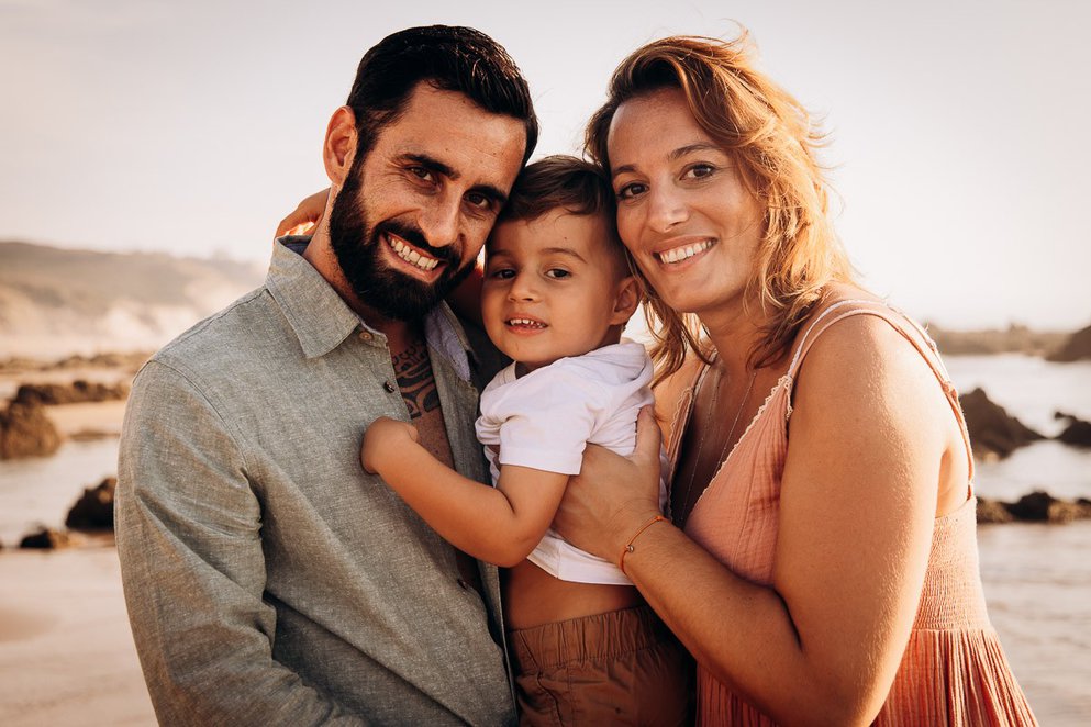 Une seance famille les pieds dans l’eau à Biarritz, une adorable future maman avec son mari et leur fils ainé sur la plage