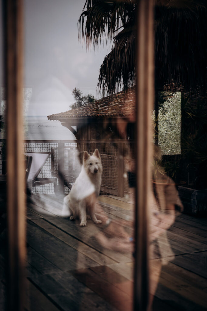 Leur chien, un splendide compagnon blanc, faisait naturellement partie de la séance. Sur la terrasse, les premiers instants partagés étaient simples et vrais : rires, regards complices et caresses échangées, avec la mer en toile de fond. Ces moments captés à la volée racontent l’histoire d’une famille en devenir, déjà soudée et joyeuse.